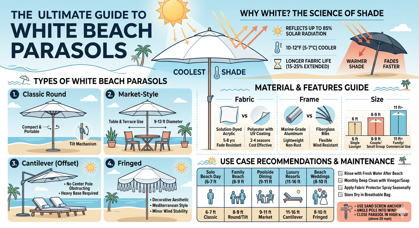 White is not merely a style choice — it is the most thermally efficient color for a beach parasol because light-colored surfaces reflect rather than absorb solar energy.